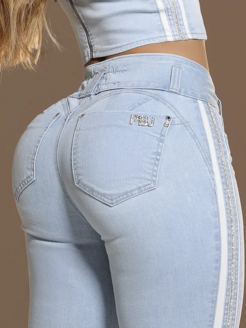 Esta calça skinny com cós largo foi criada para compor um conjunto moderno e sofisticado, aliando conforto e visual impactante. O grande diferencial da peça está na aplicação de quatro fileiras de strass sobre tecido branco nas laterais, criando um efeito de brilho contínuo com referência esportiva. A estrutura do jeans com elasticidade moderada oferece modelagem ajustada que valoriza a silhueta, enquanto o cós com elástico interno e botão flexível proporciona ajuste preciso e conforto durante o uso. Ideal para combinar com o cropped código 86825 da mesma cápsula.