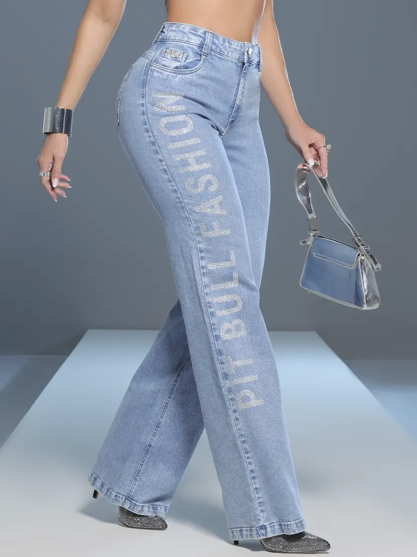 - Calça Wide Leg Cintura Alta Fashion e Elegante com Escrita Brilhosa Pit Bull Jeans