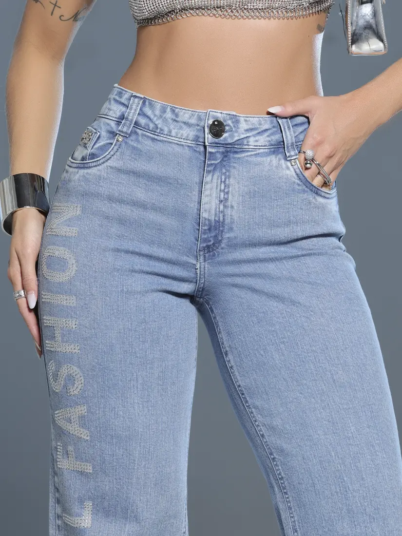 Calça Wide Leg Cintura Alta Fashion e Elegante com Escrita Brilhosa Pit Bull Jeans