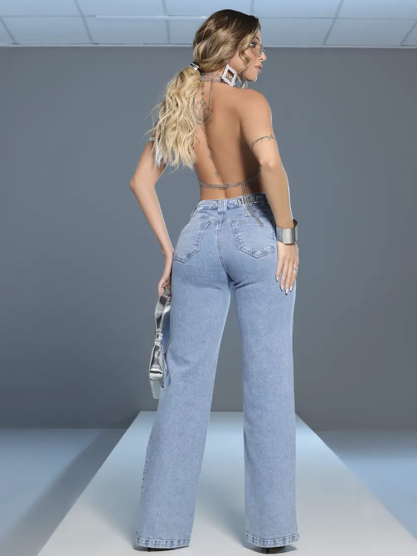 Com proposta sofisticada e visual marcante, esta calça wide leg azul claro foi criada para valorizar a silhueta com caimento fluido e acabamento técnico. A lavanderia especial realça o tom suave com efeitos destroyed, enquanto o detalhe de pedras sextavadas aplicadas com guia de laser adiciona brilho preciso e controlado. O botão flexível no cós, o zíper azul marinho e os reforços estruturais garantem funcionalidade e durabilidade, tornando esta peça ideal para composições autênticas e elegantes.