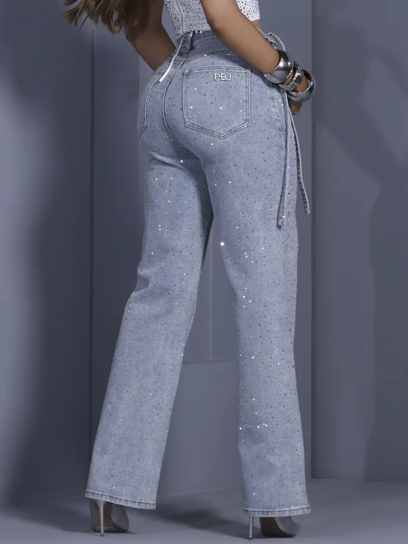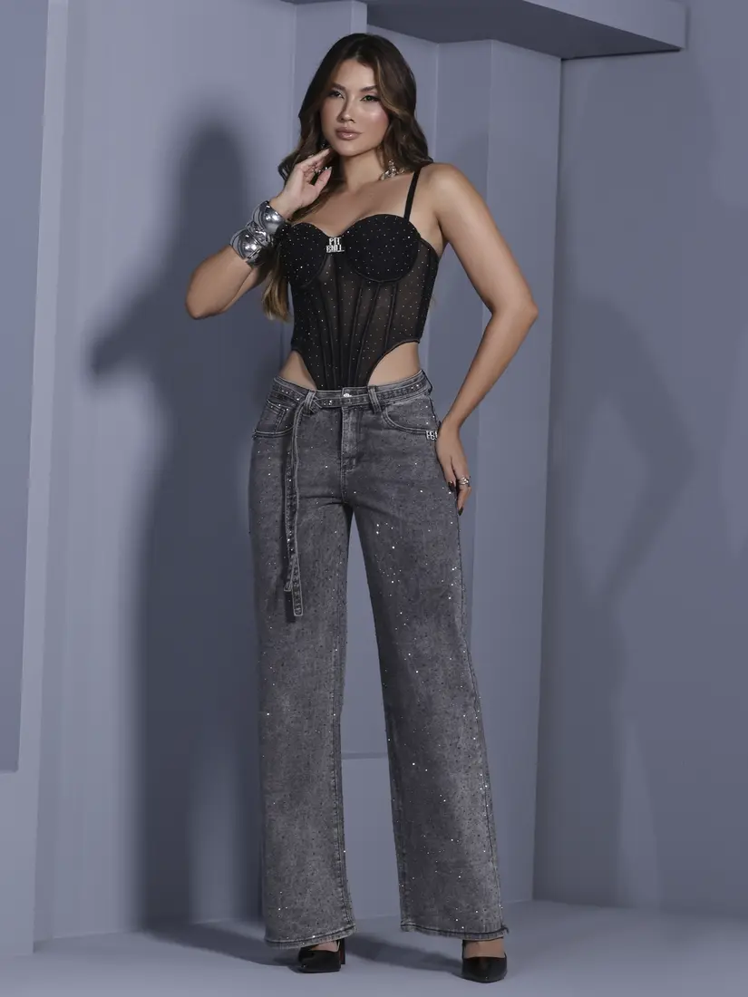 - Calça Wide Leg Conceito Sofisticada com Pedrarias e Cinto Personalizado Pit Bull Jeans