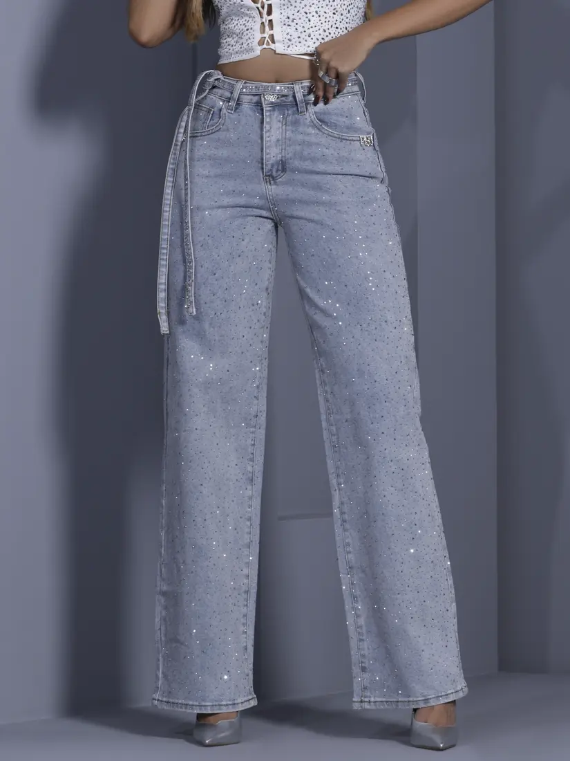 Calça Wide Leg Conceito Sofisticada com Pedrarias e Cinto Personalizado Pit Bull Jeans