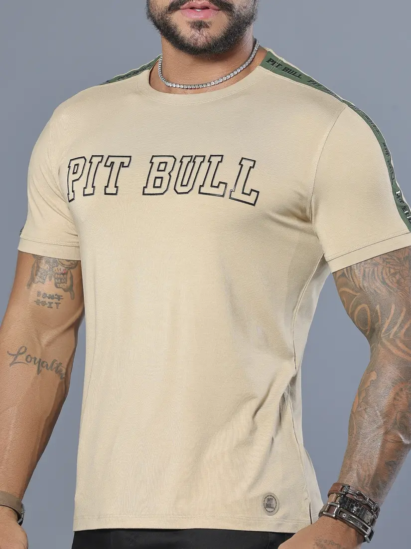 Camiseta Bege Masculina com Estampa em Relevo e Detalhe nos Ombros Pit Bull Jeans