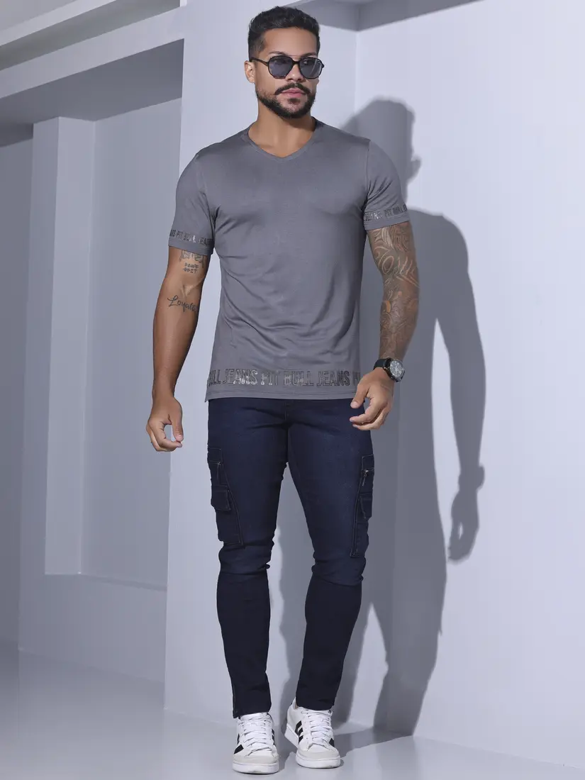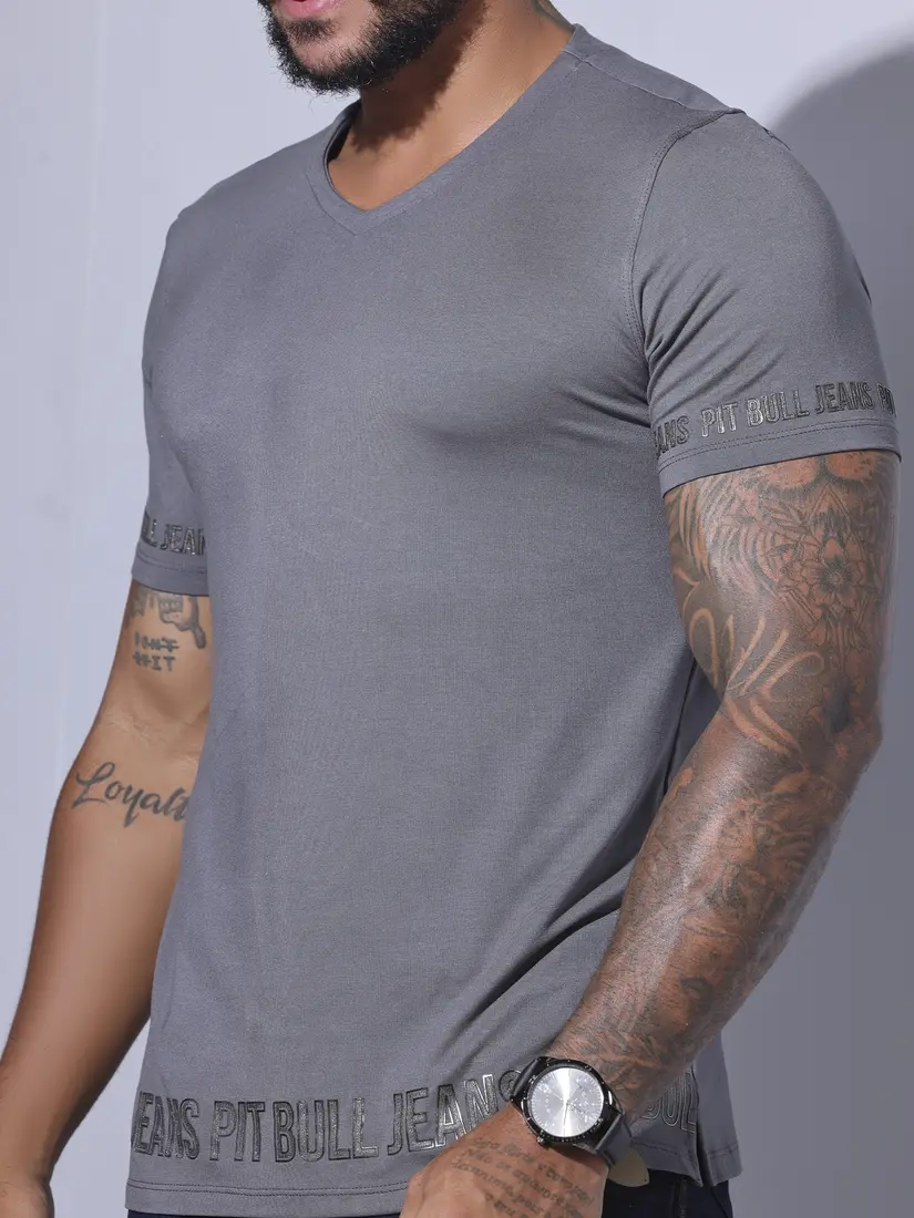 Camiseta Gola V Casual e Estilosa com Escrita em Relevo Pit Bull Jeans