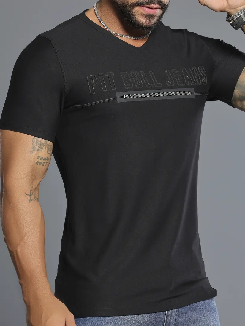 Camiseta Gola V Preta Estilosa com Bordado e Zíper Pit Bull Jeans