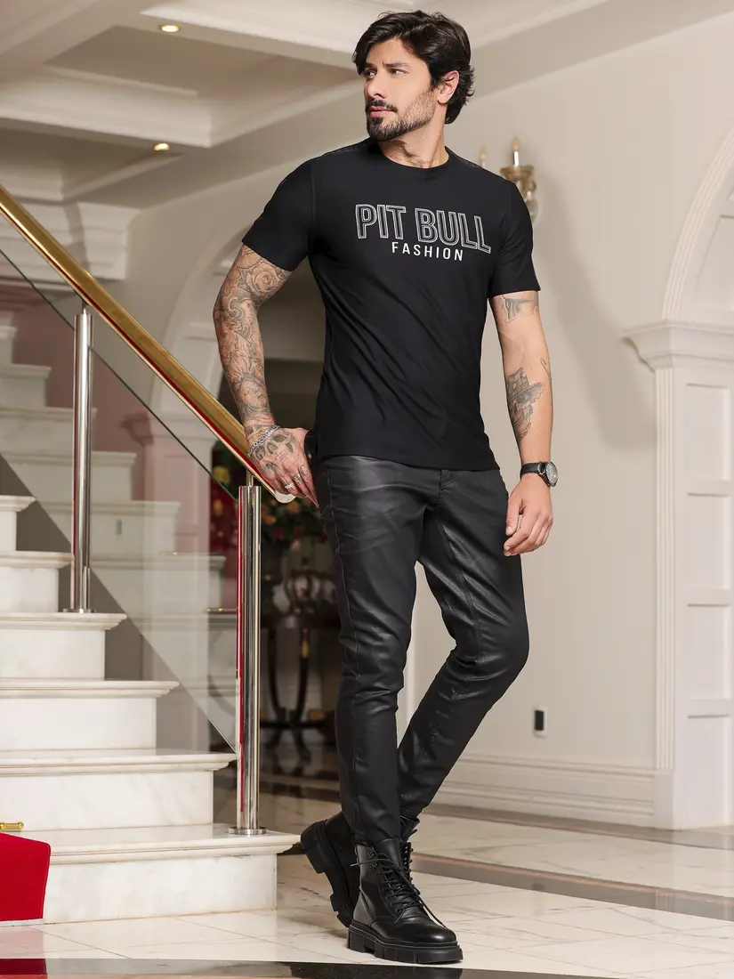 Camiseta Masculina Fashion com Estampa Metalizada e Elástico Personalizado Pit Bull Jeans