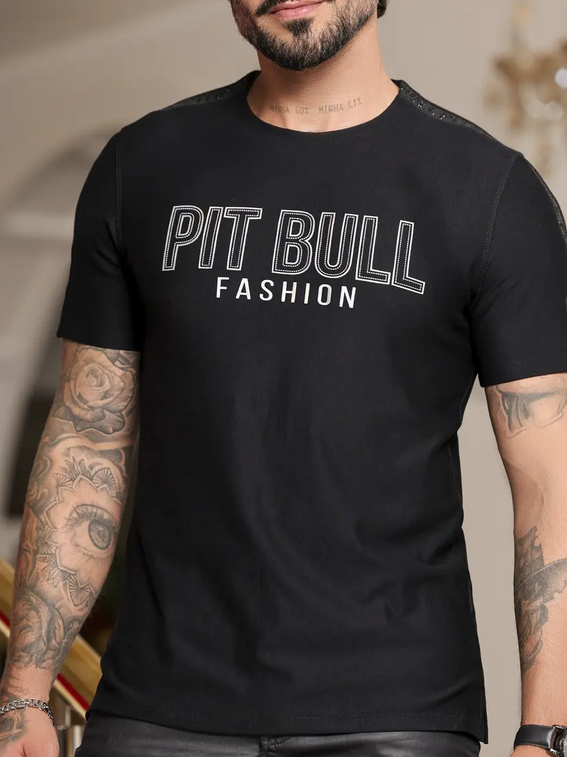 - Camiseta Masculina Fashion com Estampa Metalizada e Elástico Personalizado Pit Bull Jeans