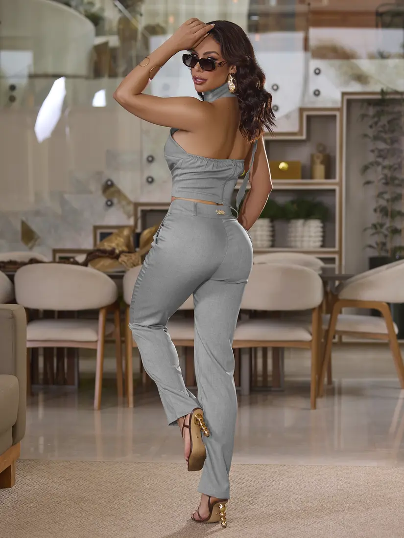 Este conjunto foi desenvolvido para unir sofisticação e modernidade em um visual versátil. A calça, com modelagem estruturada, possui bolsos funcionais que garantem praticidade no uso diário. O cropped acompanha a proposta com zíper traseiro e forro frontal no mesmo tecido, oferecendo ajuste seguro e acabamento refinado. Ideal para produções casuais ou ocasiões especiais, o conjunto destaca caimento elegante e conforto no vestir.