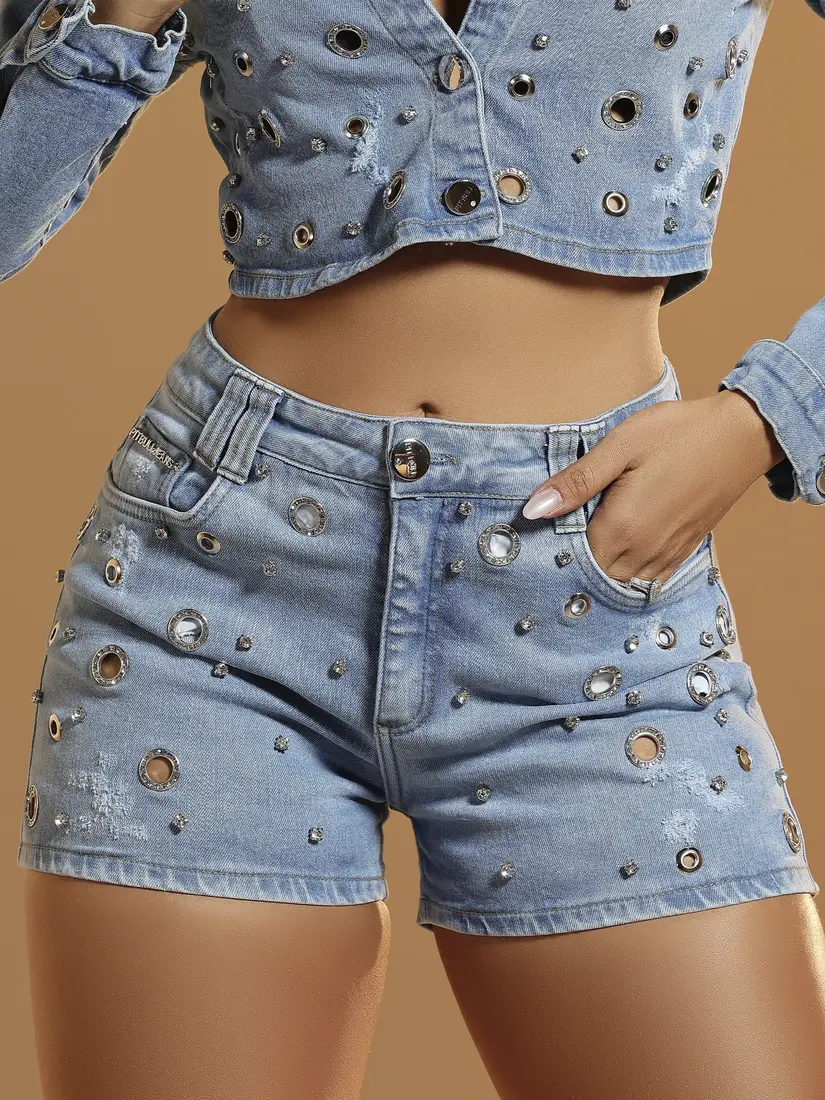 Cheio de atitude e pensado para mulheres que gostam de unir estilo e ousadia, o short conceito é a peça-chave para um visual moderno e imponente. Produzido com tecido encorpado e toque macio, ele possui aplicações manuais de strass e ilhoses metálicos estrategicamente posicionados, criando um efeito visual marcante com brilho controlado. A modelagem valoriza a silhueta com cintura alta, cós estruturado com botão flexível e barra finalizada com bainha dupla. Ideal para looks casuais com personalidade.