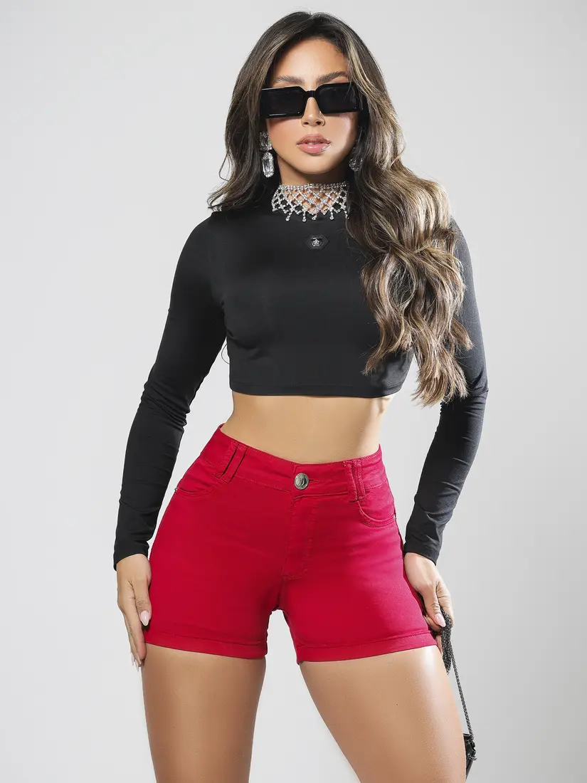 – Modelagem hot pants com cintura alta: valorização da silhueta e caimento estruturado