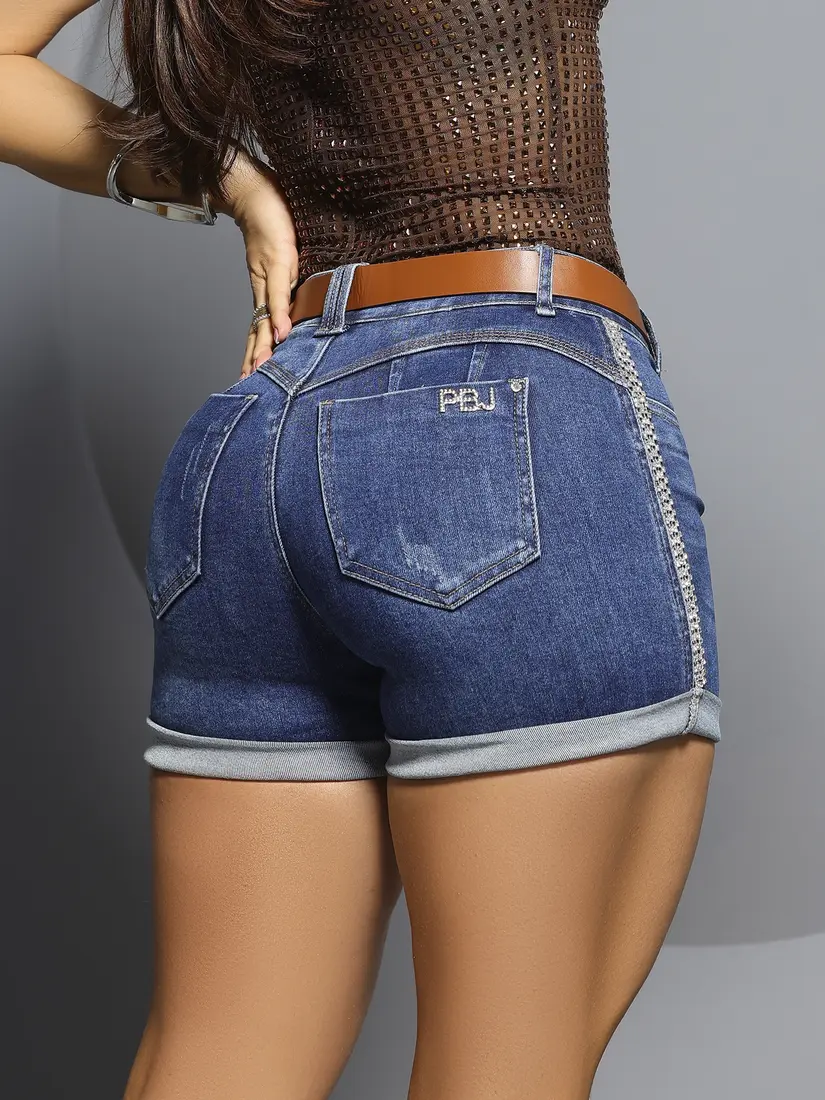 Este short jeans une conforto, elegância e brilho na medida certa. Com modelagem justa e cintura alta, valoriza a silhueta com sofisticação e atitude. A lavagem média clássica é realçada por detalhes brilhantes na lateral, que trazem um toque fashion e exclusivo. O cós firme acompanha cinto marrom com fivela metálica “PITBULL”, finalizando o look com personalidade. Conta ainda com bojo bundex removível para um efeito push up que realça o bumbum de forma natural.