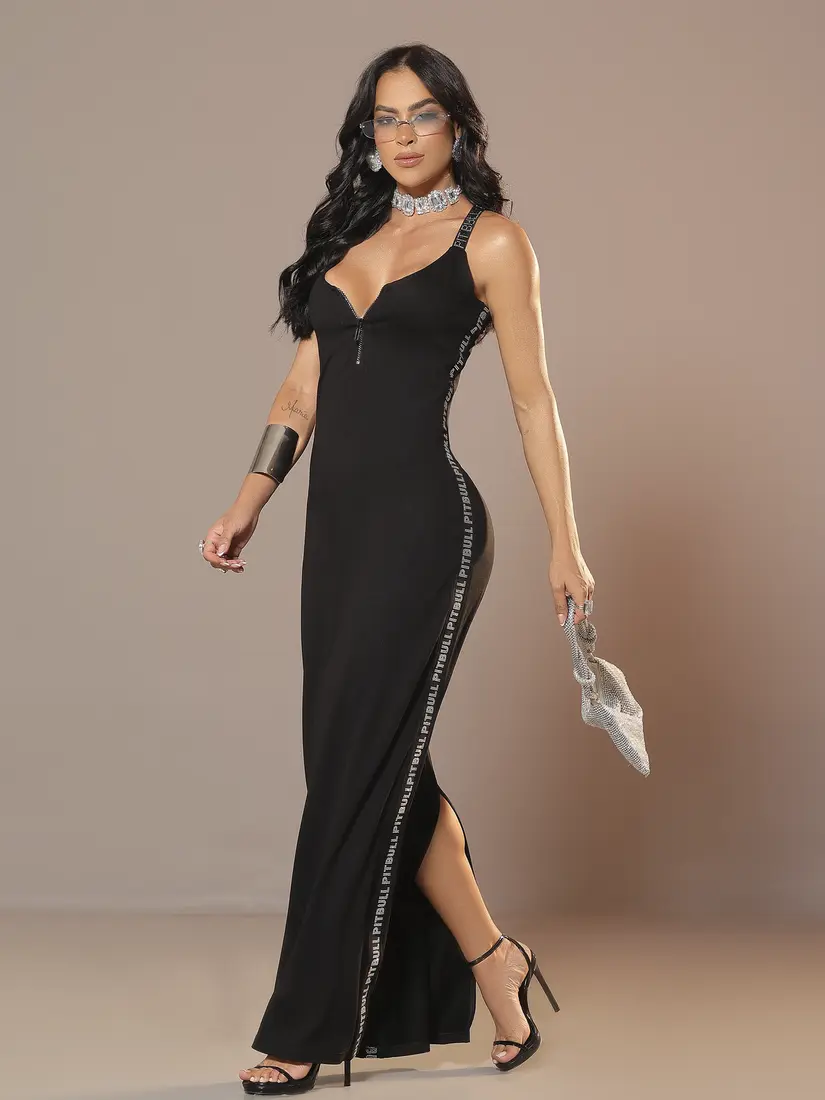 Vestido Longo Preto Elegante com Fenda nas Costas e Elástico Personalizado Pit Bull Jeans