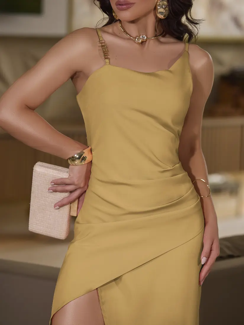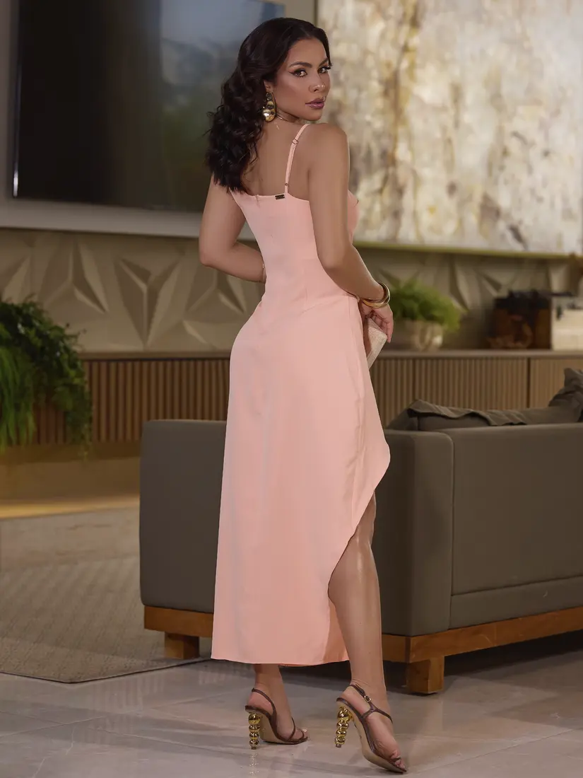 Este vestido foi desenvolvido para destacar a feminilidade com elegância e conforto. Com modelagem ajustada e fenda lateral frontal, ele proporciona liberdade de movimento sem perder a sofisticação. A parte frontal é forrada com o próprio tecido, garantindo cobertura e acabamento limpo. As alças de viés com regulagem trazem praticidade, e o enfeite metálico aplicado confere um charme adicional. Fechamento com zíper invisível nas costas, mantendo a estética refinada.