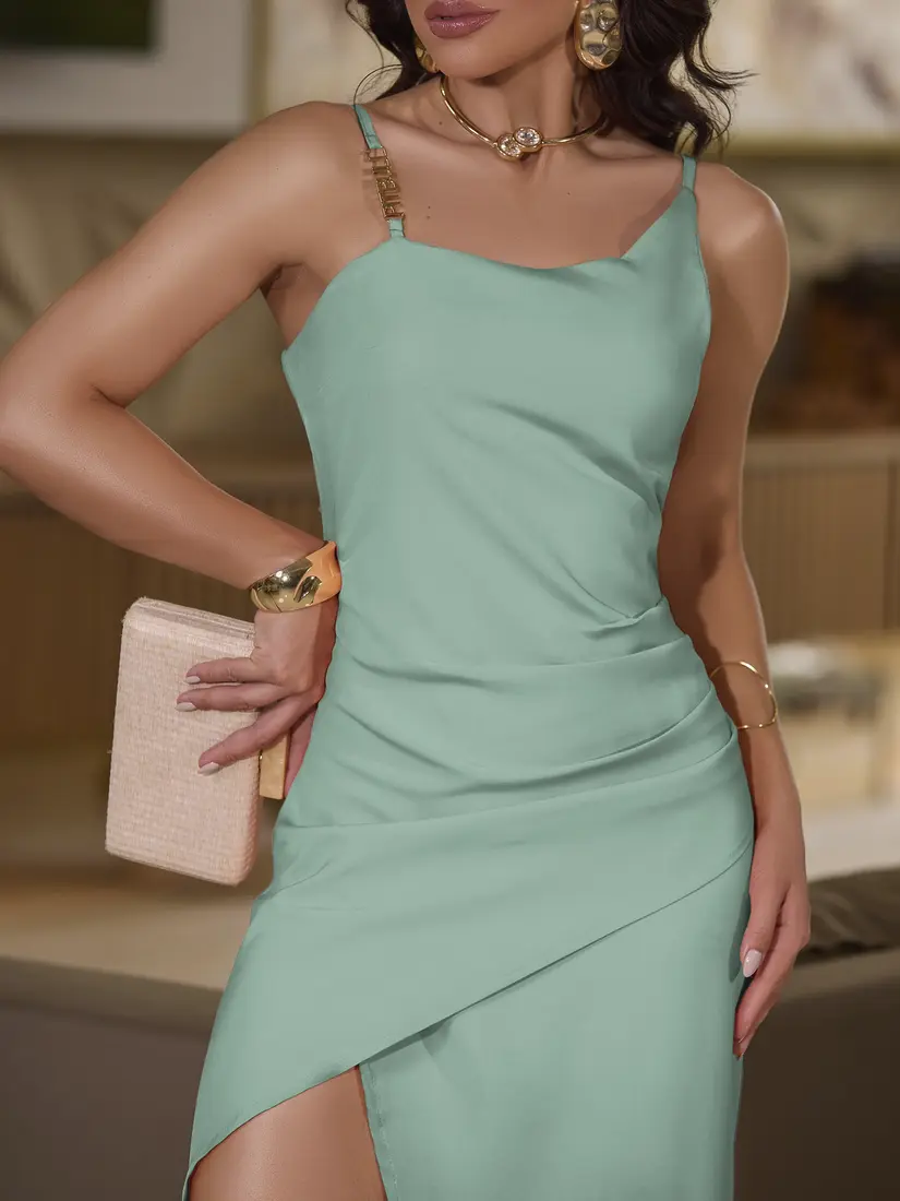 – Alças de viés com regulagem e enfeite metálico: ajuste prático com acabamento sofisticado